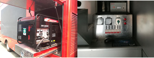 隨車安裝一臺(tái)8.5kVA靜音發(fā)電機(jī)組,確保整車用電,發(fā)電機(jī)組采用抽拉式可移出廂體外結(jié)構(gòu),方便散熱及維護(hù)。配有外接電源接口和220V移動(dòng)線盤,方便市電使用。配備電源集中控制箱,使整車電氣設(shè)備操作更安全,更方便,更人性化。發(fā)電機(jī)可抽拉
